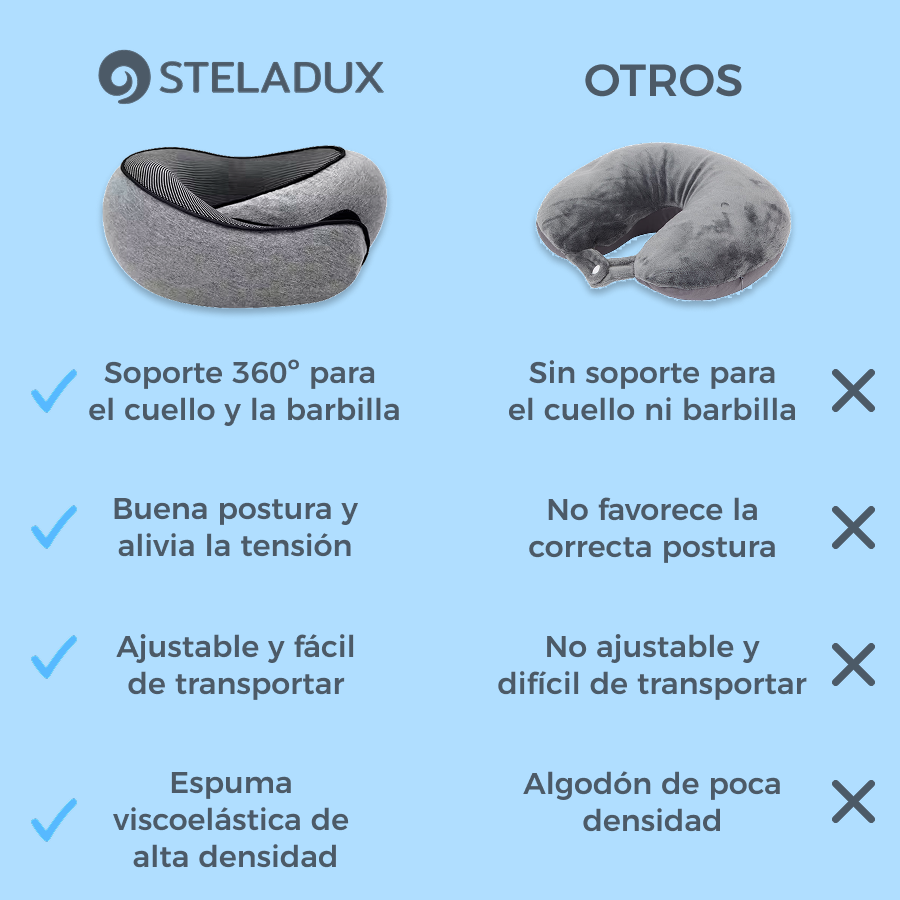 Tras meses de investigación y dedicación, presentamos Steladux®. Es el único cojín de viaje que ofrece una combinación única de soporte cervical, diseño ergonómico y materiales de primera calidad para mayor comodidad.